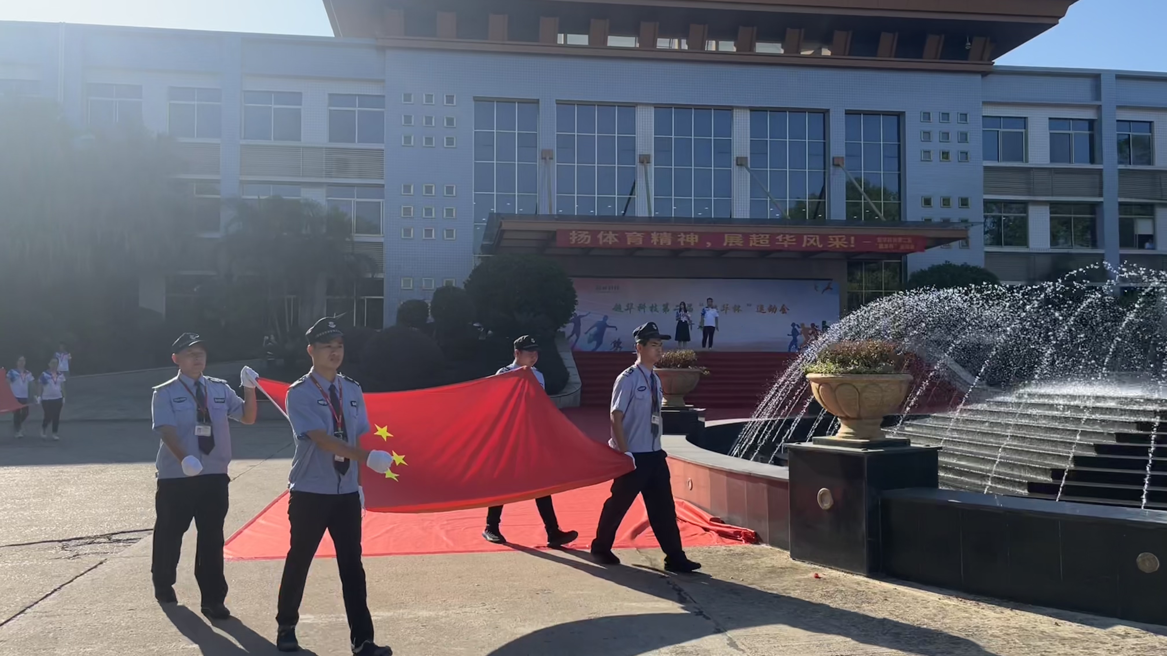 步伐整齊,精神抖擻,國旗護(hù)衛(wèi)隊(duì)邁著堅(jiān)定的步伐,護(hù)送著鮮艷的國旗入場,雄姿英發(fā),氣宇軒昂。司旗護(hù)衛(wèi)隊(duì)手握著公司旗幟,迎著朝陽,大步前進(jìn)。